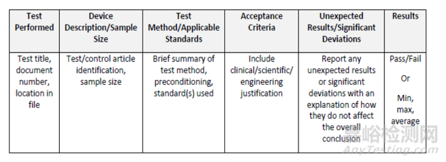 作為每個(gè)非臨床工作臺(tái)性能測(cè)試的書面敘述的替代方案,可以提供表格摘要來(lái)組織測(cè)試報(bào)告摘要中推薦的信息 (參見(jiàn)下面的示例)。如果使用匯總表,仍建議提供對(duì)結(jié)果/結(jié)論的敘述性討論。