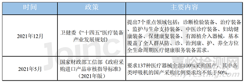 “十四五”規(guī)劃以來,國家衛(wèi)健委多次出臺(tái)相關(guān)政策法規(guī),大力支持急救和轉(zhuǎn)運(yùn)呼吸機(jī)等醫(yī)療設(shè)備發(fā)展,國家財(cái)政部、工信部在2021年5月明確要求各類呼吸機(jī)的采購國產(chǎn)產(chǎn)品比例不低于50%。