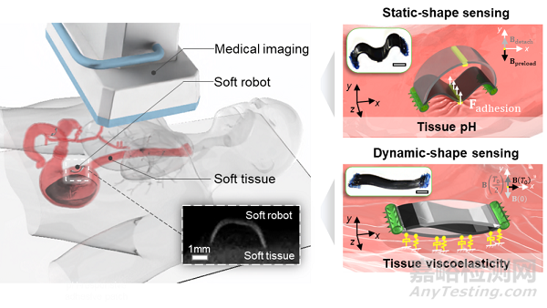 這項工作提出了一個使用無線微型軟機器人和醫(yī)學(xué)成像來感知軟組織的生理特性的通用框架。該框架使用無線驅(qū)動的微型機器人與軟組織表面相互作用,同時使用醫(yī)學(xué)成像監(jiān)測其形狀變化,從而為監(jiān)測和了解疾病發(fā)展期間生物體內(nèi)的組織生物力學(xué)打開了一扇門,并為疾病治療提供反饋信息。因此,該系統(tǒng)為可用的微創(chuàng)傳感方法和醫(yī)療設(shè)備增加了前所未有的功能,并有在基礎(chǔ)研究和臨床實踐中實現(xiàn)多種應(yīng)用的潛力。