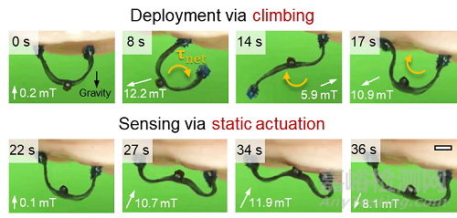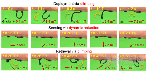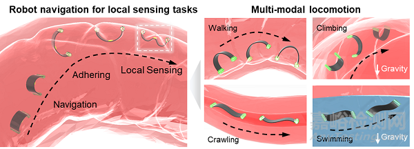 德國馬克斯普朗克智能系統(tǒng)研究所及美國范德堡大學(xué)聯(lián)合研制出了一種結(jié)合無線軟體機器人和醫(yī)學(xué)成像的系統(tǒng)來感知組織的高級生理特性,包括器官深處的粘附力、pH 值和粘彈性(圖一)。機器人的身體由具有磁性的橡膠制成的,它的雙足經(jīng)過特別設(shè)計可以粘附在組織表面,機器人可以在外界磁場的驅(qū)動下彎曲變形(圖二),在磁場的遠程控制下以多種運動模式穿越組織屏障到達指定位置后(圖三),利用身體上用于進行檢測的貼片與軟組織的相互作用,同時通過醫(yī)學(xué)成像進行監(jiān)控和跟蹤,實現(xiàn)對傳統(tǒng)的醫(yī)學(xué)成像工具、電子傳感器和其他現(xiàn)有醫(yī)療設(shè)備難以測量的生物特性的檢測。論文以“In-Situ Sensing Physiological Properties of Biological Tissues using Wireless Miniature Soft Robots” 為題發(fā)表在Science Advances上。文章的共同第一作者為德國馬克斯普朗克研究所博士生王春翔,博士后吳英丹博士,及美國范德堡大學(xué)助理教授董曉光博士。同時,文章的共同通訊作者為美國范德堡大學(xué)機械工程學(xué)院的董曉光教授及德國馬克斯普朗克智能系統(tǒng)研究所的Metin Sitti教授。