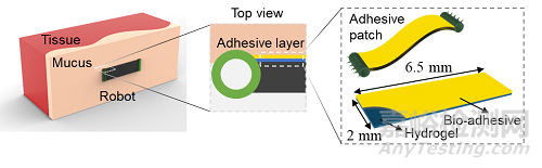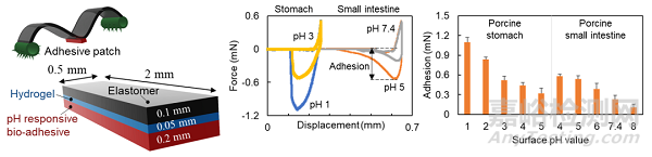 將進行特殊設(shè)計的對組織表面pH值進行響應(yīng)的粘附貼片附加在機器人身體上(圖五),該方法可以通過貼片與組織的粘附力進而對組織的 pH進行檢測。