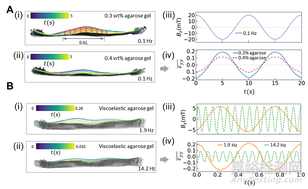 圖八,軟體機器人針對不同材料和在不同磁場頻率下的動態(tài)形狀變化