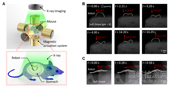 這款機器人具有監(jiān)測和了解患有疾病的軟組織的生物力學(xué)的潛力。在X射線成像設(shè)備下,機器人首先被部署到小鼠模型的患病區(qū)域,再由外部磁場驅(qū)動以實現(xiàn)檢測組織pH與粘彈性(圖九)。