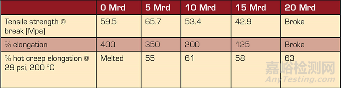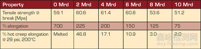 表II中的結(jié)果表明,硬度為72D的COPA確實(shí)發(fā)生了交聯(lián),并且對(duì)高劑量輻照也非常敏感。當(dāng)材料暴露的輻照劑量低于10兆拉德時(shí),似乎發(fā)生了有用的交聯(lián)。從5兆拉德時(shí)拉伸強(qiáng)度的小幅提高可以看出,物理性能的提高很小。拉伸強(qiáng)度從10兆拉德時(shí)開(kāi)始下降。伸長(zhǎng)率在5兆拉德時(shí)穩(wěn)定下降,并在20兆拉德時(shí)急劇下降。在熔點(diǎn)以上進(jìn)行的熱蠕變是交聯(lián)的真實(shí)指標(biāo)。如果材料沒(méi)有交聯(lián),樣品就會(huì)融化并斷裂,如0兆拉德的樣品所示。