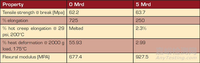 試驗(yàn)3。第三次試驗(yàn)使用硬度為72D的聚酰胺熱塑性彈性體,交聯(lián)劑類(lèi)型及用量與第二次試驗(yàn)相同。在這次試驗(yàn)中,模壓成型樣品被用于測(cè)試?yán)鞆?qiáng)度和伸長(zhǎng)率、彎曲模量和熱變形。樣品輻照劑量為5兆拉德。