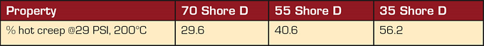 表V. 不同硬度的COPA化合物使用2.5%交聯(lián)劑在10 Mrd下進(jìn)行交聯(lián)后1/8英寸厚圓盤(pán)試樣的熱蠕變?cè)囼?yàn)結(jié)果。