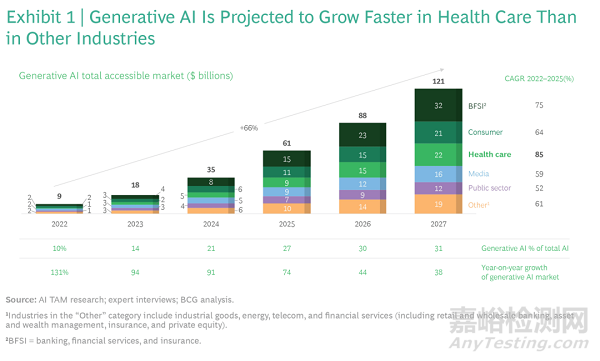 BCG認(rèn)為,這種不作為可能會(huì)使公司長(zhǎng)期處于劣勢(shì)。預(yù)計(jì)生成式人工智能在醫(yī)療保健領(lǐng)域的增長(zhǎng)速度將超過任何其他行業(yè),到2027 年的復(fù)合年增長(zhǎng)率為 85%,總市場(chǎng)規(guī)模將達(dá)到 220 億美元。