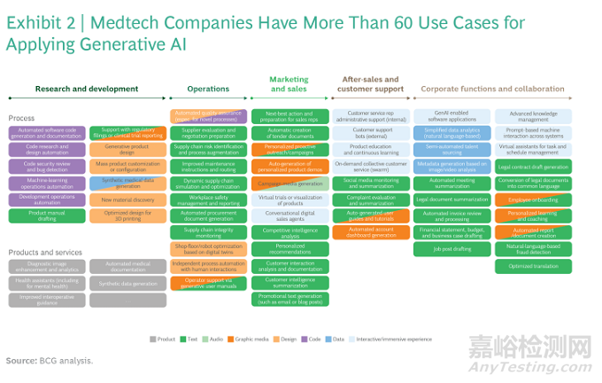 為了幫助領(lǐng)導(dǎo)者理解各種選擇,BCG在醫(yī)療技術(shù)領(lǐng)域確定了 60 多個(gè)生成人工智能的用例。