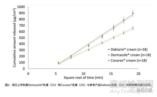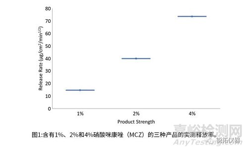 為了測試IVRT方法是否有選擇性,以準(zhǔn)確辨別產(chǎn)品性能差異,使用USP< 1724>章節(jié)中描述的統(tǒng)計(jì)方法,將含有2%MCZ的霜與具有較高和較低MCZ濃度的測試產(chǎn)品進(jìn)行比較。此外,IVRT方法準(zhǔn)確證明“相同性”的能力,通過Daktarin®霜(2%)與自身的兩兩比較進(jìn)行測試。