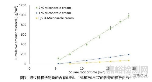 Daktarin®霜中MCZ的釋放率(2%)明顯高于1%和0.5%MCZ霜(圖3)。這可能是由于Q3的差異,即與物質(zhì)的微觀結(jié)構(gòu)和排列的差異,以及Q1/Q2的差異有關(guān),圖3所示的釋放曲線表明,IVRT系統(tǒng)可以區(qū)分使用不同規(guī)格,不同制劑工藝的制劑。