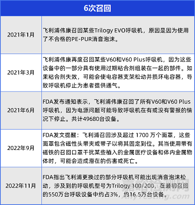 自2021年,飛利浦宣布在全球范圍內(nèi)召回?cái)?shù)百萬臺睡眠呼吸暫停和呼吸機(jī)。而后召回事件不斷發(fā)酵,截至今年1月,飛利浦呼吸機(jī)已經(jīng)召回6次,擴(kuò)大至550萬臺,遠(yuǎn)高于最初估計(jì)的300萬至400萬臺。