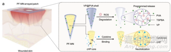 如圖1所示,在這項(xiàng)研究中,作者所描述的核殼結(jié)構(gòu)MN貼片,可以程序化的方式調(diào)節(jié)炎癥、增殖和重塑階段。為了實(shí)現(xiàn)這一系列功能, 作者利用ROS可降解的聚乙烯醇(VP@PVA外殼)作為PF-MN的外殼層,其中還負(fù)載有治療劑維替泊芬(VP),用于細(xì)菌抑制和傷口重塑;而由交聯(lián)肝素(cHP內(nèi)核)作為內(nèi)核組分,可發(fā)揮免疫調(diào)節(jié)作用。