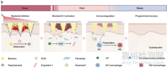 如圖2所示,應(yīng)用于傷口后,MNs有效地破壞了細(xì)菌生物膜,然后嵌入的VP在激光照射下可產(chǎn)生ROS,以根除抗生素都無(wú)法徹底相除的細(xì)菌。隨后,隨著炎癥階段的發(fā)展,MN外殼在氧化應(yīng)激下逐漸降解,導(dǎo)致負(fù)載的VP釋放。釋放的VP是Yes相關(guān)蛋白(YAP)的抑制劑,可以進(jìn)一步阻斷成纖維細(xì)胞中Engrailed-1(En1)的激活,以促進(jìn)無(wú)瘢痕皮膚再生。同時(shí),暴露的cHP核心通過(guò)結(jié)合和中和各種炎癥因子來(lái)啟動(dòng)免疫微環(huán)境的調(diào)節(jié),誘導(dǎo)巨噬細(xì)胞從M1(促炎)表型向M2(抗炎)表型分化,促進(jìn)從炎癥向增殖的相變。此外,免疫微環(huán)境的調(diào)節(jié)還促進(jìn)了血管生成和細(xì)胞外基質(zhì)沉積,最終導(dǎo)致無(wú)瘢痕再生。根據(jù)這一設(shè)計(jì),在急性傷口和糖尿病小鼠模型以及兔耳疤痕模型上,無(wú)瘢痕傷口愈合過(guò)程都得到了有效加速。