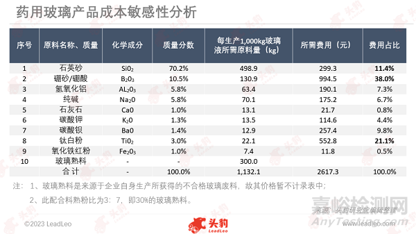 以美國(guó)康寧產(chǎn)品Corning51-A的原料構(gòu)成來計(jì)算其價(jià)格變化對(duì)其成本的影響(敏感性分析)為例:影響配合料價(jià)格的主要原料為硼酸硼砂、石英砂、氧化鋁和純堿,它們分別占總成本的38%、11.4%、7.3%和6.7%。因此,這些主要原料市場(chǎng)價(jià)格的變化將直接影響每噸藥用玻璃的成本,其敏感性越高,關(guān)注度越大,是企業(yè)考慮流動(dòng)資金、庫存?zhèn)淞?、定產(chǎn)安排、銷售價(jià)格及利潤(rùn)預(yù)期定位的敏感數(shù)據(jù)。