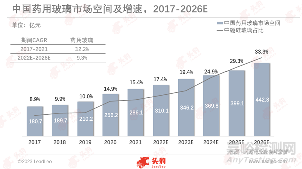 中國(guó)藥用玻璃市場(chǎng)空間從2017年的180.7億元人民幣增長(zhǎng)至2021年286.1億元人民幣,于2017至2021年期間的年復(fù)合增長(zhǎng)率為12.2%。隨著產(chǎn)能過剩與競(jìng)爭(zhēng)加劇,小、亂、散與低端線的清出,預(yù)計(jì)未來五年市場(chǎng)增長(zhǎng)漸趨平穩(wěn)態(tài)勢(shì),年復(fù)合增長(zhǎng)率水平在9.3%左右。目前,中國(guó)藥用玻璃市場(chǎng)中中硼硅產(chǎn)品占比仍較低,與國(guó)際上占比40%相較有較大差距,整體行業(yè)需要向高端高質(zhì)轉(zhuǎn)型,行業(yè)集中度進(jìn)一步提升。