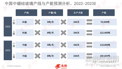 從產(chǎn)線端來看,2022年,中國(guó)中硼硅玻璃生產(chǎn)線已有45條,已投或在建產(chǎn)線為8條,中硼硅玻璃每條產(chǎn)線日產(chǎn)約為5-8噸,總產(chǎn)量最低為7.7萬噸,滿產(chǎn)產(chǎn)量為12.2萬噸,相較于2022年中硼硅玻璃年需求量5萬噸,已明顯產(chǎn)能過剩。預(yù)計(jì)至2023年底,中國(guó)或?qū)⒔ǔ?0條中硼硅玻璃生產(chǎn)線,最低產(chǎn)量為12.0萬噸,滿產(chǎn)產(chǎn)能為19.0萬噸,相較于年需求量或?qū)⒊尸F(xiàn)產(chǎn)能過剩的現(xiàn)象。