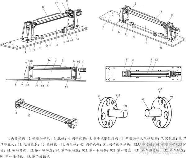 研磨面平尺的底端通過(guò)研磨面平尺限位結(jié)構(gòu)限位設(shè)置在調(diào)平機(jī)構(gòu)上。調(diào)平機(jī)構(gòu)用于調(diào)整研磨面平尺的平整度,包括通過(guò)至少三個(gè)調(diào)平旋鈕設(shè)置在底板上的調(diào)平板,三個(gè)調(diào)平旋鈕的設(shè)置使得調(diào)平板的調(diào)平更加平穩(wěn)。