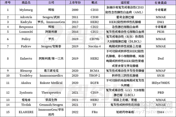 截至2022年底,全球已累計(jì)批準(zhǔn)上市了15款A(yù)DC藥物,市場(chǎng)規(guī)模已超72億美元,同比增長(zhǎng)31%。其中6款在國(guó)內(nèi)上市,包括羅氏的Kadcyla(恩美曲妥珠單抗)、Seagen/武田的Adcetris(維布妥昔單抗)、輝瑞的Besponsa(奧加伊妥珠單抗)、榮昌生物的愛(ài)地希(維迪西妥單抗)、Immunomedics的Trodelvy(戈沙妥珠單抗)、2023年上市的阿斯利康/第一三共的注射用德曲妥珠單抗。