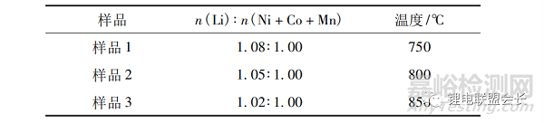 將NCM811材料前驅(qū)體Ni0.8Co0.1Mn0.1(OH)2和LiOH按設(shè)定化學(xué)計(jì)量比混合。在高速混料機(jī)中,以700r/min的轉(zhuǎn)速將原料混合0.5h。將混合物放入剛玉坩堝中,置于箱式氣氛燒結(jié)爐內(nèi),在氧氣氣氛及特定溫度下分別燒結(jié)12h,在氧氣環(huán)境下自然冷卻至室溫,得到NCM811樣品。在不同的鋰配比及溫度區(qū)域選取了3個(gè)試驗(yàn)點(diǎn),各樣品對(duì)應(yīng)的n(Li)∶n(Ni+Co+Mn)及燒結(jié)溫度見(jiàn)表1。
