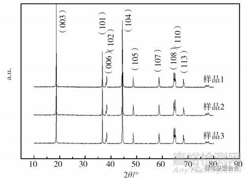 從表2可知,盡管樣品3選取了高燒結(jié)溫度低鋰配比加入量的工藝條件,制備的NCM811材料中堿性雜質(zhì)碳酸鋰殘留的質(zhì)量分?jǐn)?shù)仍有1.22%,氫氧化鋰有0.69%,高于購(gòu)買(mǎi)的三元材料產(chǎn)品。