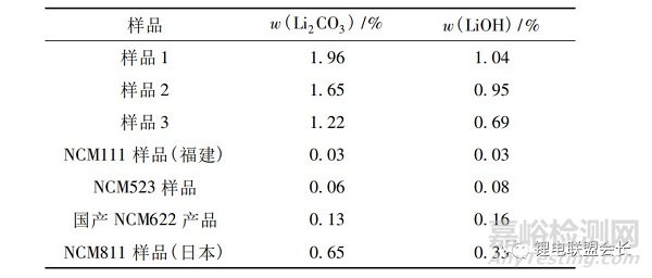 選取NCM811(日本產(chǎn))、NCM622(湖南產(chǎn))、NCM523(浙江產(chǎn))和 NCM111(福建產(chǎn))樣品作為堿性雜質(zhì)殘留分析的對(duì)比樣品。將5g粉體樣品置于95g去離子水溶液中,攪拌5min后抽濾。用電位滴定儀,根據(jù)等當(dāng)點(diǎn)值V1、V2,計(jì)算溶液中Li2CO3及LiOH 的含量,并以含量作為雜質(zhì)代表組成物。