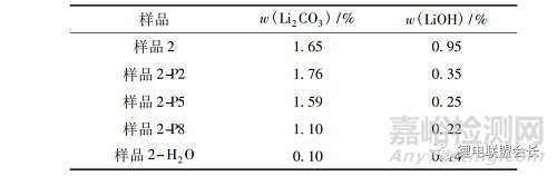 此外,研究中對(duì)堿性雜質(zhì)分離轉(zhuǎn)化的方案是:以純水淋洗的方式處理NCM811材料,利用堿性雜質(zhì)可溶于水的特性,實(shí)現(xiàn)表面堿性雜質(zhì)從體系的分離(樣品 2-H2O)。不同降堿工藝得到的樣品的堿性雜質(zhì)含量見(jiàn)表3。