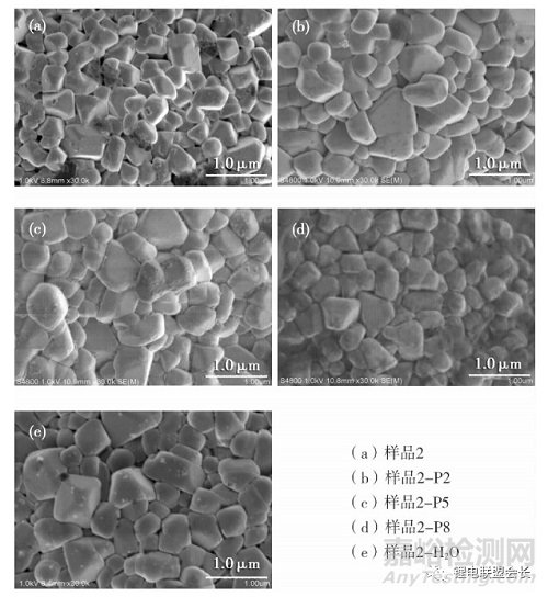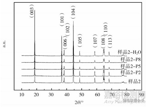 從圖3可知,樣品2表面可見(jiàn)明顯的暗色區(qū)域,沒(méi)有固定形貌,應(yīng)為顆粒表面殘留的、含鋰的弱導(dǎo)電性堿性雜質(zhì);處理后的樣品2-P2中,未觀察到明顯的深色暗色區(qū)域物質(zhì),同時(shí),在顆粒表面形成的是一層較薄的包覆層。隨著磷酸鹽加入量的增加,顆粒表面的清晰程度逐漸降低,顆粒的邊界也逐漸模糊。經(jīng)水洗處理后的樣品2-H2O,顆粒表面干凈,邊界清晰且顆粒間隙更大。從顆粒形貌的角度分析,兩種處理方式都可實(shí)現(xiàn)堿性雜質(zhì)的分離或無(wú)害化處理。