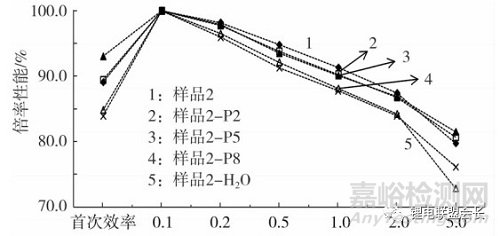 樣品2及經(jīng)降堿處理后樣品的半電池倍率數(shù)據(jù)見(jiàn)圖4。