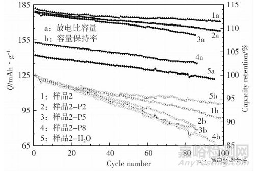從圖5可知,經(jīng)過(guò)磷酸鹽處理的樣品,1C比容量較未處理的樣品2明顯降低,且隨著磷酸鹽加入量的增加,比容量分別降低約1mAh/g(樣品2-P2)、27mAh/g(樣品2-P5)和37mAh/g(樣品2-P8),同時(shí),容量保持率也低于樣品2。磷酸鹽處理樣品在表面形成了不提供容量的惰性物質(zhì)。磷酸鹽處理的樣品與未處理的樣品相比,循環(huán)保持率變差證明處理過(guò)程中鋰原子可能從結(jié)構(gòu)中脫出。