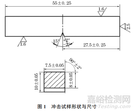 在回火后的試驗鋼上取樣,經(jīng)鑲樣,磨拋,用體積分數(shù)4%的硝酸酒精溶液浸蝕后,使用光學顯微鏡觀察顯微組織。在試驗鋼上加工出如圖1所示的沖擊試樣,按照GB/T 229-2020,使用沖擊試驗機進行室溫(20℃)沖擊試驗。