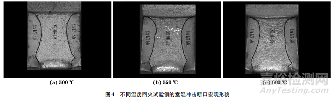 由圖4可見,當回火溫度為500,550,600℃時,試驗鋼在室溫下沖擊斷口的宏觀形貌相似,均由剪切唇和纖維區(qū)組成,剪切斷面率均為100%,為完全韌性斷裂。
