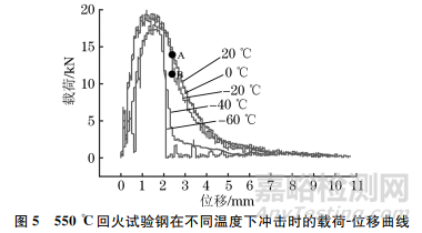 由圖5可見:550℃回火試驗鋼在0℃和20℃下沖擊時的載荷-位移曲線幾乎重合,并且載荷在達到最大值后,隨著位移的增加緩慢降低。當沖擊試驗溫度降低到-20 ℃、位移小于2.4mm時,載荷-位移曲線與沖擊試驗溫度為0,20℃下幾乎重合,而在位移約為2.4mm處載荷由 14.02kN突降到11.32kN(A-B段),這表明試樣的承載能力突降,裂紋迅速擴展,試驗鋼已進入韌脆轉(zhuǎn)變區(qū);該過程消耗的能量很少,可以忽略不計。當沖擊試驗溫度降低至-40℃時,試驗鋼的載荷在達到最大值立刻急劇下降,在很短的位移內(nèi)下降了80%以上,這表明裂紋迅速擴展,且擴展距離很大,該過程只消耗了很少的能量。當沖擊試驗溫度降低至-60℃時,載荷在達到最大值后下降得更加迅速,在裂紋擴展過程中幾乎沒有能量消耗。值得注意的是,-60℃時載荷驟降對應(yīng)的裂紋擴展尺寸相當大,這意味著工程應(yīng)用構(gòu)件在失效過程中幾乎不會發(fā)生變形,而是瞬間斷裂,容易造成災(zāi)難性事故。