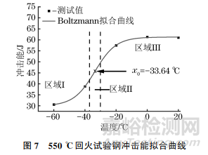 使用Boltzmann函數(shù)對圖7的沖擊能數(shù)據(jù)點進行回歸分析,可知550℃回火試驗鋼的韌脆轉(zhuǎn)變溫度為-33.64℃。在該溫度點附近,材料斷裂所消耗的沖擊能是極度不穩(wěn)定的,溫度稍有降低,都會導(dǎo)致材料的沖擊韌性急劇下降。