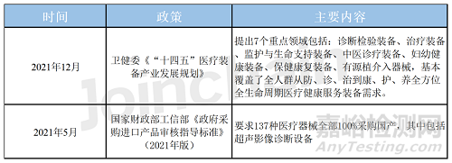 “十四五”規(guī)劃以來,國家衛(wèi)健委多次出臺(tái)相關(guān)政策法規(guī),大力支持超聲影像診斷設(shè)備等高端醫(yī)療設(shè)備發(fā)展,國家財(cái)政部、工信部在2021年5月明確要求包括超聲影像診斷設(shè)備在內(nèi)的137種設(shè)備全部采購國產(chǎn)。