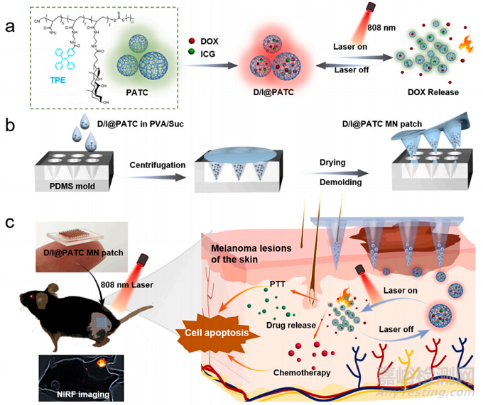 圖1:用于黑色素瘤治療的D/I@PATC MN貼片示意圖。a) D/I@PATC聚合物顆粒的制備及激光觸發(fā)藥物可視化釋放。b) D/I@PATC MN貼片的制作工藝。c)用于激光觸發(fā)化學-光熱協(xié)同治療黑色素瘤的D/I@PATC MN貼片示意圖。