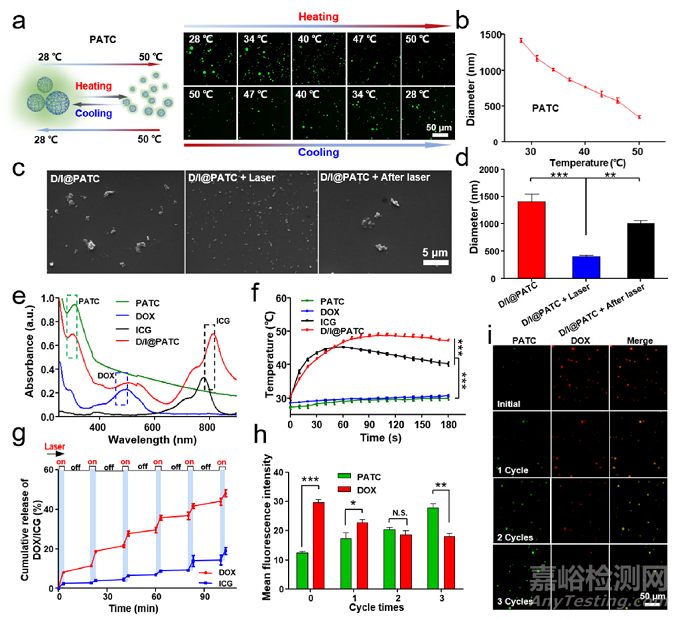 D/I@PATC顆粒的可視化相變表征。a) AIE活性PATC微粒可逆可視化相變過程示意圖和CLSM圖像。b)不同溫度下PATC懸浮液的水動力直徑。c)掃描電鏡圖像和d)激光照射前后D/I@PATC的尺寸定量。e) PATC、DOX、ICG和D/I@PATC的紫外-可見吸收光譜。綠色、藍色和黑色虛線框分別表示PATC、DOX和ICG的特征峰。f)以PATC、DOX和ICG為對照樣品,808 nm (0.5 W/cm2)照射下D/I@PATC粒子的光熱效應。g)在808 nm激光(0.5 W/cm2)開(3 min)/關(17 min)周期照射下,D/I@PATC在PBS溶液中的體外累積DOX和ICG釋放量。i) 808 nm激光反復“開/關”循環(huán)照射(3 min, 0.5 W/cm2)前后D/I@PATC粒子的代表性熒光圖像和h)對應的定量熒光強度。綠色熒光:PATC; 紅色熒光:DOX。每個點代表平均值±SD (n = 3)。*p<0.05, **p<0.01, ***p <0.001. N.S.表示沒有差異。