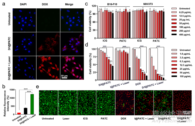D/I@PATC釋放DOX的細胞攝取及體外細胞化療和光熱效應。a)無808 nm激光照射(0.5 W/cm2, 3 min)或用D/I@PATC孵育8 h后B16-F10對DOX的細胞攝取。b)不同處理B16-F10細胞對應的定量紅色熒光強度。c)不同濃度ICG和PATC孵育24 h后B16-F10和NIH/3T3細胞的細胞活力d) DOX、D/I@PATC、I@PATC激光和D/I@PATC激光處理B16-F10細胞的細胞活力。4種處理的DOX濃度一致。e) 不同材料處理B16-F10細胞的活/死細胞染色實驗。綠色熒光:鈣黃綠素,紅色熒光:碘化丙啶(PI)。每個點代表平均值±SD (n = 3)。每個點代表平均值±SD (n = 3)。*p<0.05, **p<0.01, ***p <0.001. N.S.表示沒有差異。