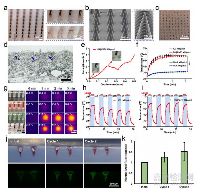 D/I@PATC微針的表征。a) D/I@PATC MN貼片插入皮膚前(右上)和后(右下)的代表性光學顯微鏡圖像。D/I@PATC顆粒集中在MN尖端前部。b) D/I@PATC MN陣列的SEM圖像。c)離體皮膚植入MN貼片后大鼠皮膚代表性明場顯微鏡圖像。d)明場顯微鏡下大鼠皮膚MN貼片植入后的組織學切片代表圖。藍色箭頭表示皮下遞送的D/I@PATC顆粒。e) D/I@PATC MN貼片的力學行為。f) 808 nm激光照射(0.5 W/cm2)下,空白MN貼片、DOX MN貼片、ICG MN貼片和D/I@PATC MN貼片的溫度變化曲線和g)對應的立體顯微照片/熱像圖。h) ICG MN貼片和i) D/I@PATC MN貼片在5次激光“開/關”循環(huán)照射下的時間-溫度曲線。j) D/I@PATC MNs插入瓊脂凝膠,反復激光照射后的熒光圖像。k)光照射后凝膠中D/I@PATC MNs的熒光強度變化。每個點代表平均值±SD (n = 3)。*p<0.05, **p<0.01, ***p <0.001. N.S.表示沒有差異。