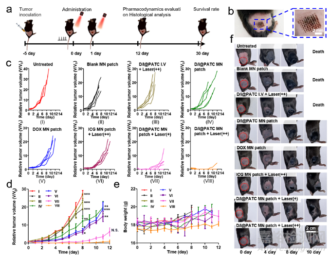 D/I@PATC MN貼片對B16-F10黑色素瘤小鼠的抗腫瘤活性。a)處理過程示意圖。b)插入D/I@PATC MN貼片后C57BL/6小鼠腫瘤部位的代表性圖像。c) 8個不同治療組的個體和d)平均腫瘤生長曲線。e)不同處理后小鼠的體重曲線和f)腫瘤生長動力學照片。每個點代表平均值±SD (n = 3)。*p<0.05, **p<0.01, ***p <0.001. N.S.表示沒有差異。