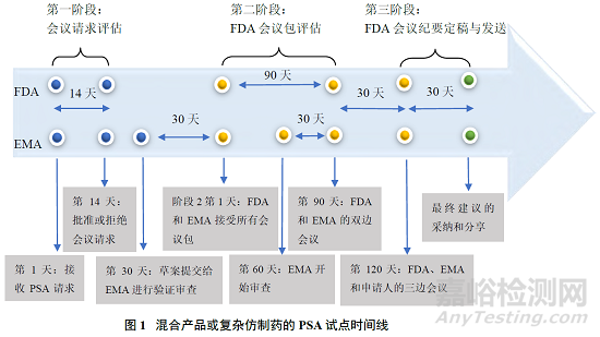 根據(jù)上述 PSA 程序 3 個(gè)階段的概述,可總結(jié)出 EMA 與 FDA 的混合產(chǎn)品或復(fù)方仿制藥的 PSA 試點(diǎn)時(shí)間表,如圖 1 所示。