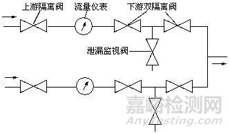 通常儀表上下游分別裝有隔離閥,能使儀表與管線液流隔離,以便維護(hù)。上游閥應(yīng)全開,還應(yīng)離儀表足夠距離避免儀表進(jìn)口的流速分布畸變。在多管線儲運(yùn)應(yīng)用電下游閥可采用嚴(yán)密的雙閥關(guān)閉和泄漏監(jiān)示,如圖所示。常設(shè)置備用儀表管線或旁路管,使能不停流作維護(hù)或取下儀表校驗。
