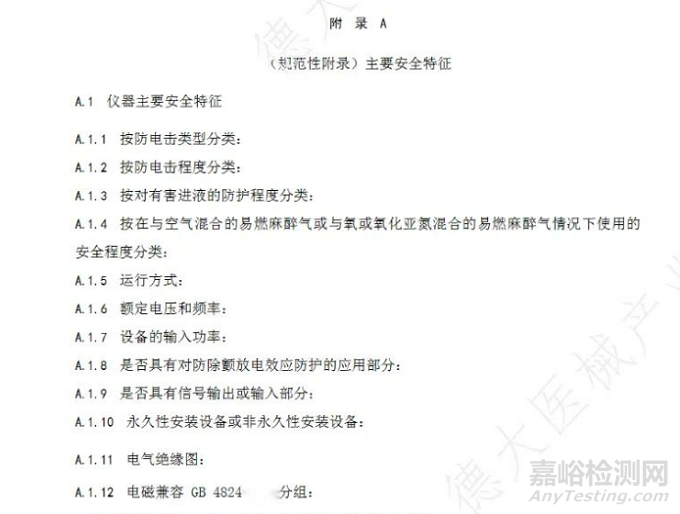 根據(jù) GB9706.1-2020《醫(yī)用電氣設(shè)備 第1部分:基本安全和基本性能的通用要求》和 YY9706.102-2021《醫(yī)用電氣設(shè)備 第1-2部分:基本安全和基本性能的通用要求 并列標(biāo)準(zhǔn): 電磁兼容要求和試驗(yàn)》,技術(shù)要求附錄 A 中主要安全特征內(nèi)容如下圖所示: