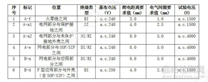 2) 電氣絕緣參數(shù)表:應(yīng)表格包含絕緣路徑、絕緣類型、基準(zhǔn)電壓、試驗(yàn)電壓爬電距離、電氣間隙等內(nèi)容,如下圖所示: