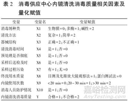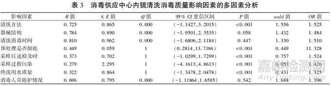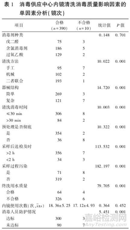 1、單因素分析結(jié)果顯示:包括清洗方法、器械結(jié)構(gòu)、清洗消毒時間、預(yù)處理是否徹底、采樣后送檢及時、采樣過程污染、終洗用水質(zhì)量、消毒人員防護情況等(P<0.01),見表1。