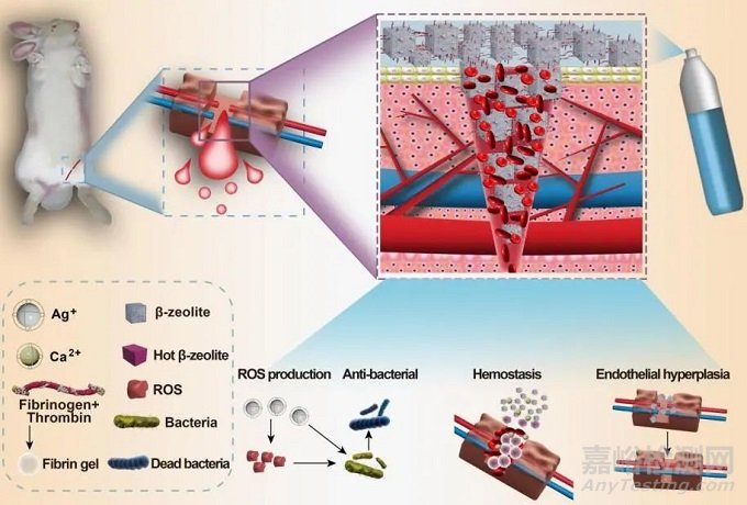 本論文合成了一種沸石基復(fù)合止血劑Ag-βZ-F/T,能快速封堵術(shù)后血管破裂、減輕熱損傷,同時具備抗菌活性、促進(jìn)傷口愈合。作用機制(1)在Ag-βZ放熱止血基礎(chǔ)上,纖維蛋白原(F)/凝血酶(T)轉(zhuǎn)換為纖維蛋白,纖維蛋白凝膠不僅通過與紅細(xì)胞的大接觸面積協(xié)同促進(jìn)凝血,還可以作為物理屏障覆蓋Ag-βZ,減少溶劑熱釋放,避免高溫對周圍組織的損傷。(2)Ag-βZ中Ag的原位引入產(chǎn)生活性氧(ROS),可以殺死細(xì)菌,減輕感染,并促進(jìn)人臍靜脈內(nèi)皮細(xì)胞(HUVECs)的增殖,從而加速傷口愈合。本論文采用的噴涂方法增強了使用適用性,具有易于操作的便利性。(圖1)