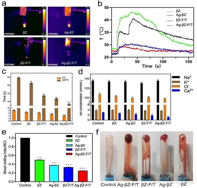 利用紅外熱像儀監(jiān)測不同沸石基材料的溫度變化曲線,發(fā)現(xiàn)Ag-βZ和βZ的溫升(約14-15℃)明顯高于相應(yīng)的F/T聯(lián)合止血劑(即Ag-βZ-F/T和βZ-F/T)的溫升(約2-4℃)。表明,F(xiàn)/T的引入有效地降低了沸石的放熱(圖2a,b)。凝血功能指標(biāo)、電解質(zhì)濃度水平、體外凝血指數(shù)等數(shù)據(jù)指標(biāo)間接驗證了復(fù)合沸石止血劑的體外凝血能力(圖2c-e)。目視凝血試驗更直接表明Ag-βZ-F/T具有最強的凝血能力(圖2f)。這歸因于F/T的引入將纖維蛋白原轉(zhuǎn)化為纖維蛋白,形成大接觸面積的物理屏障,進(jìn)一步結(jié)合血細(xì)胞,加速凝血。