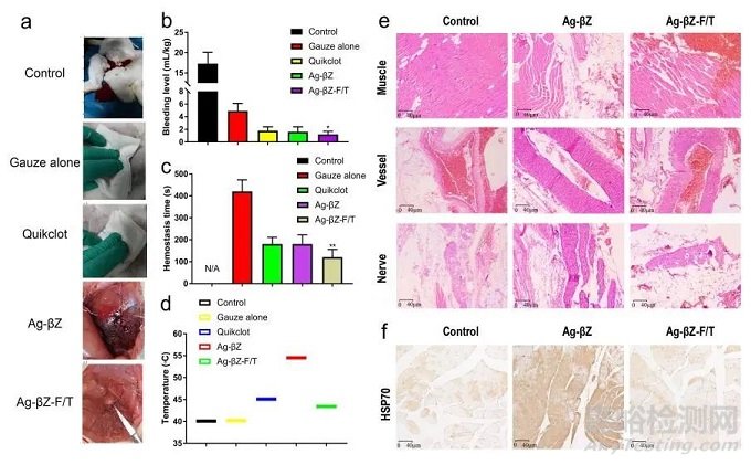 為了進(jìn)一步驗證復(fù)合止血噴霧的止血能力及組織熱損傷情況,我們建立了新西蘭兔股動靜脈致死性損傷模型。可以看到,各實驗組中Ag-βZ-F/T止血速度最快,出血量最少(圖3b,c),止血后的創(chuàng)面視野干凈清晰(圖3a),處理后切口最高溫度僅略高于對照組(40.1℃),達(dá)到43.4℃(圖3d),病理無明顯血管、神經(jīng)及肌肉損傷(圖3e),熱休克蛋白(HSP70)的表達(dá)較對照明顯降低(圖3f)。與Ag-βZ-F/T相反,Ag-βZ雖同樣具有明顯的止血效果,但產(chǎn)熱嚴(yán)重,最高溫度達(dá)到54.5℃(圖3d),存在神經(jīng)膜增厚,纖維變形(圖3e),HSP70)的表達(dá)顯著上調(diào)。這些結(jié)果表明F/T的引入確實降低了沸石產(chǎn)生的溶劑熱水平,降低了溫度,避免了對周圍組織的熱損傷。