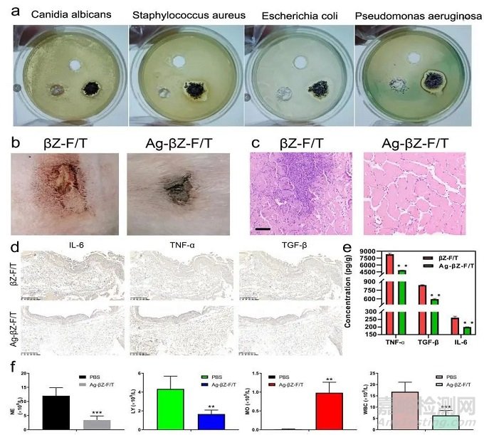 平板抑菌實驗顯示,在各組菌群中,僅Ag-β z - F /T處理組(右下)周圍存在明顯的抑菌環(huán),PBS處理組(上)和βZ-F/T處理組(左下)均未發(fā)現(xiàn)明顯的抑菌環(huán)(圖4a)。這與Ag介導(dǎo)產(chǎn)生的活性氧(ROS)的殺菌作用直接相關(guān)。為了進(jìn)一步觀察止血劑的體內(nèi)抗菌能力,我們建立了新西蘭兔股動靜脈的金黃色葡萄球菌感染模型,組織切口分別用Ag-βZ-F/T及βZ-F/T處理,3天后觀察,發(fā)現(xiàn)βZ-F/T處理后的創(chuàng)面出現(xiàn)明顯的紅腫和膿腫,而Ag-βZ-F/T處理后的創(chuàng)面依然干燥,無紅腫和膿腫形成(圖4b),病理切片未見明顯炎細(xì)胞浸潤(圖4c),炎癥因子水平、炎性細(xì)胞數(shù)目也明顯降低(圖4d-f),這些結(jié)果可以表明,含Ag止血劑的摻雜使Ag-βZ-F/T復(fù)合止血劑具有高度抗菌性。此外,我們通過追蹤新西蘭兔致死性股動靜脈分離模型的CD34免疫組化結(jié)果發(fā)現(xiàn),隨著時間的推移(3、7、14 d),經(jīng)Ag-βZ-F/T處理后的切口處CD34的表達(dá)顯著增高,遠(yuǎn)高于僅用紗布處理止血的切口。已知CD34是組織修復(fù)的生物標(biāo)志物,這充分表明Ag-βZ-F/T處理止血能加速組織修復(fù)。