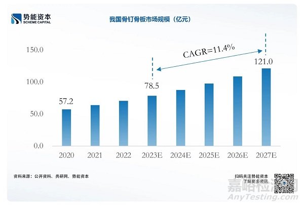 在我國(guó)人口老齡化背景下,骨折患者數(shù)量攀升,骨釘和接骨板應(yīng)用需求或?qū)⒊掷m(xù)攀升,行業(yè)發(fā)展確定性較高。預(yù)計(jì)2023年我國(guó)骨釘骨板市場(chǎng)規(guī)模可達(dá)78.5億元,2027年預(yù)計(jì)可達(dá)121億元,2023-2027年CAGR達(dá)11%。