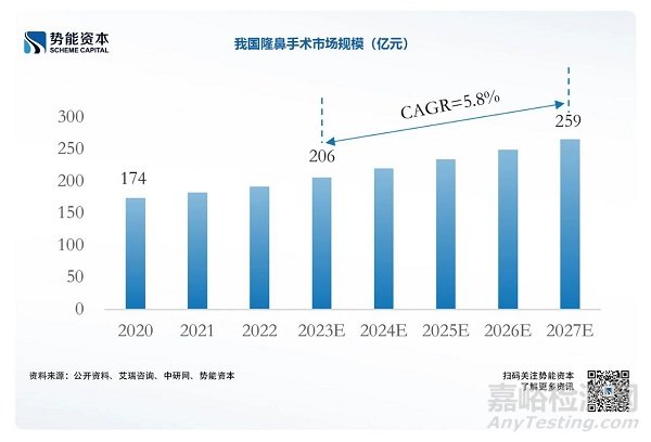 我國(guó)醫(yī)美市場(chǎng)巨大,2022年我國(guó)醫(yī)療美容市場(chǎng)規(guī)模達(dá)2479億元,其中手術(shù)類(lèi)醫(yī)美市場(chǎng)(開(kāi)眼角、眼瞼整形術(shù)、假體隆鼻、下頜磨骨等)占比超60%,達(dá)1497億元,以隆鼻手術(shù)為例,預(yù)計(jì)我國(guó)醫(yī)美整形隆鼻手術(shù)2023年市場(chǎng)規(guī)模約206億元,2027年可達(dá)約259億元,2023-2027年CAGR約5.8%。